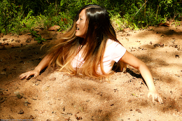deadly quicksand! She steps in and sinks quickly to her thighs.