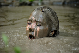 Little Mina doesn't mind getting hip deep in a bog, but once