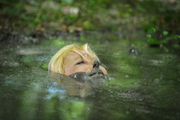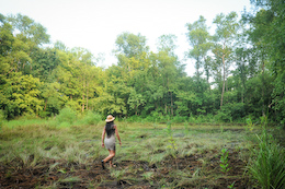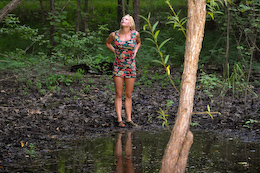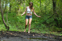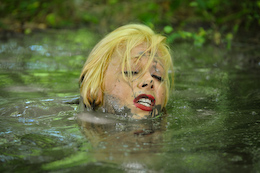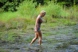 Wearing a tiny 'jungle' bikini, she wanders briefly through a swamp
