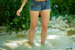 bubbling sand is irresistible to her bare feet. And also her legs,